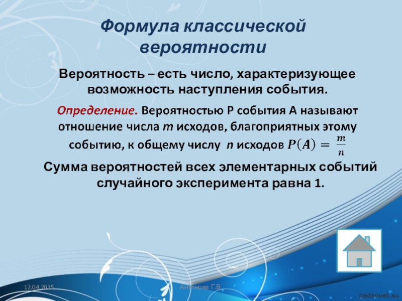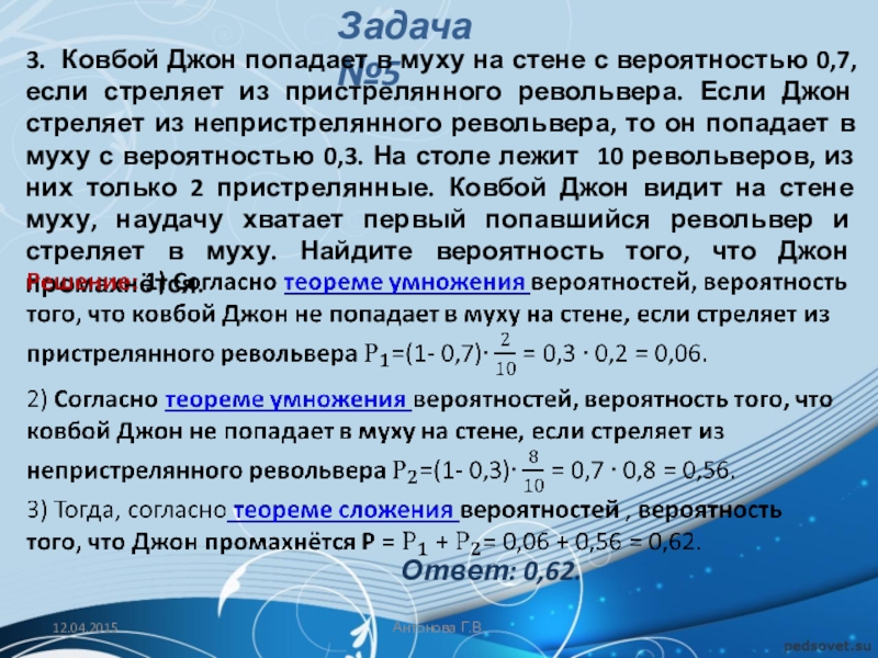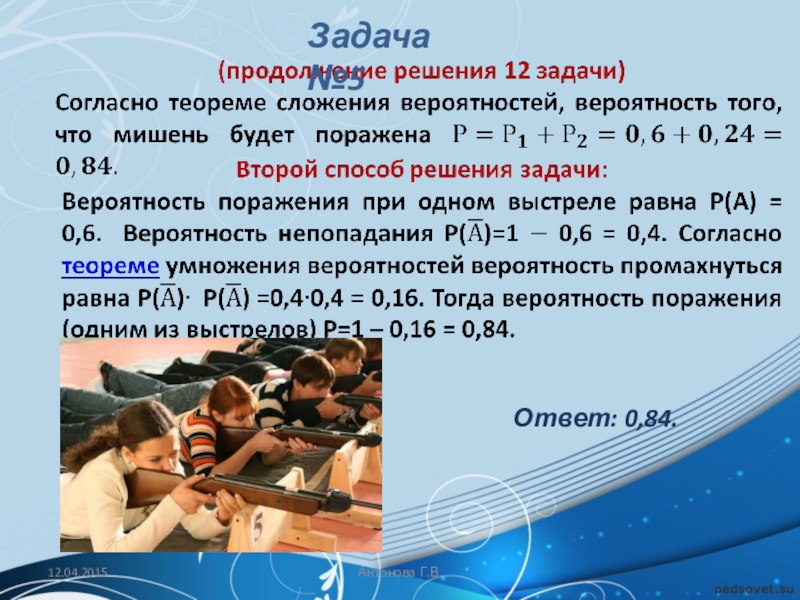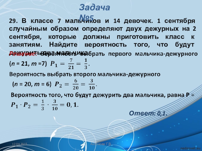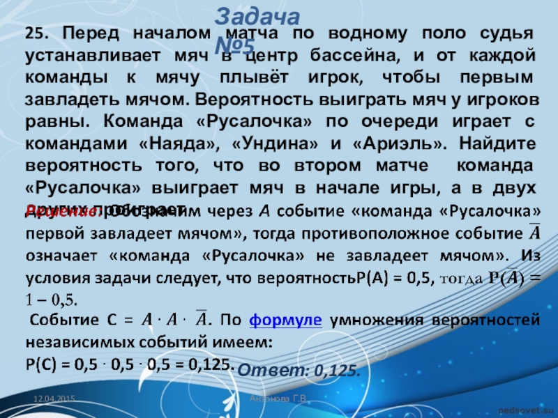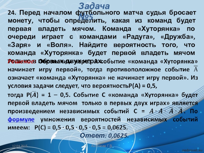 Решение: Обозначим через A событие «начинает игру Петя». Тогда количество благоприятствующих исходов m = 1, а общее число равновозможных исходов n (начинает игру Петя, начинает игру Вася, начинает игру Коля, начинает игру Лёша).