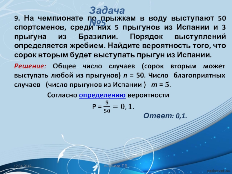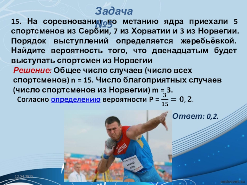 Решение: Общее число случаев (число всех спортсменов) n = 15. Число благоприятных случаев (число спортсменов из Норвегии) m = 3.