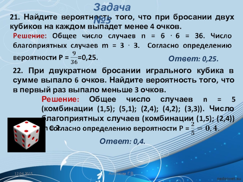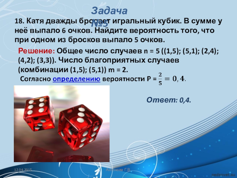 20. Таня и Нина играют в кости. Они бросают кость по одному разу. Выигрывает тот, кто выбросил больше очков. Если очков выпало поровну, то наступает ничья. В сумме выпало 6 очков. Найдите вероятность того, что Таня выиграла.