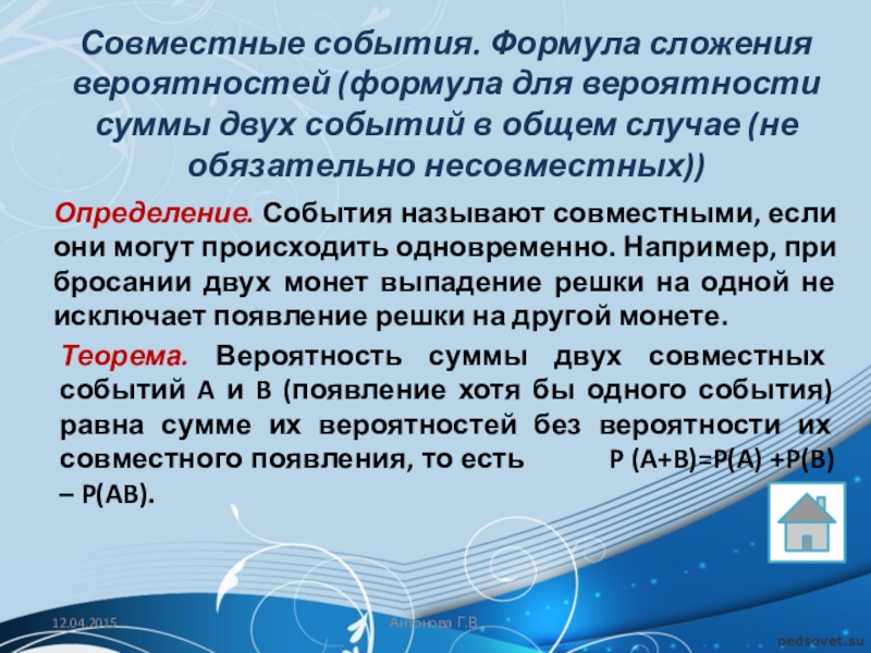 Определение. События называют совместными, если они могут происходить одновременно. Например, при бросании двух монет выпадение решки на одной не исключает появление решки на другой монете.