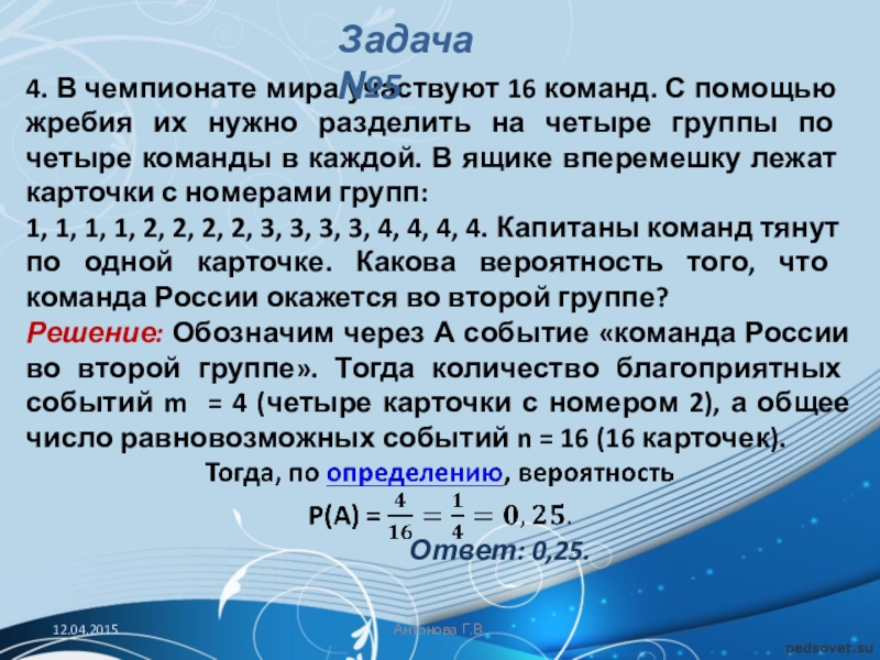 Решение: Обозначим через А событие «команда России во второй группе». Тогда количество благоприятных событий m = 4 (четыре карточки с номером 2), а общее число равновозможных событий n = 16 (16 карточек).