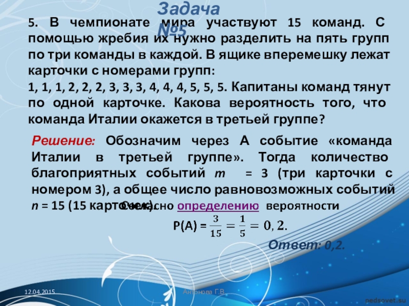 Решение: Обозначим через А событие «команда Италии в третьей группе». Тогда количество благоприятных событий m = 3 (три карточки с номером 3), а общее число равновозможных событий n = 15 (15 карточек).