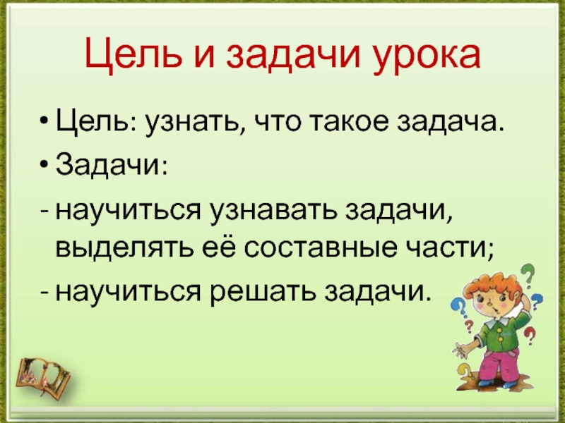 Цель и задачи урокаЦель: узнать, что такое задача.Задачи: научиться узнавать задачи, выделять её составные части;научиться решать задачи.