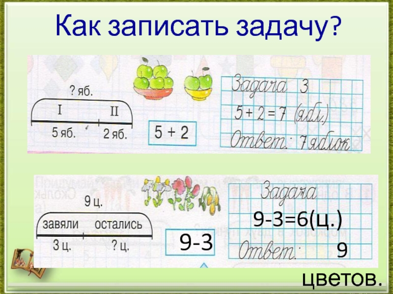 Как записать задачу?9-39-3=6(ц.)9 цветов.