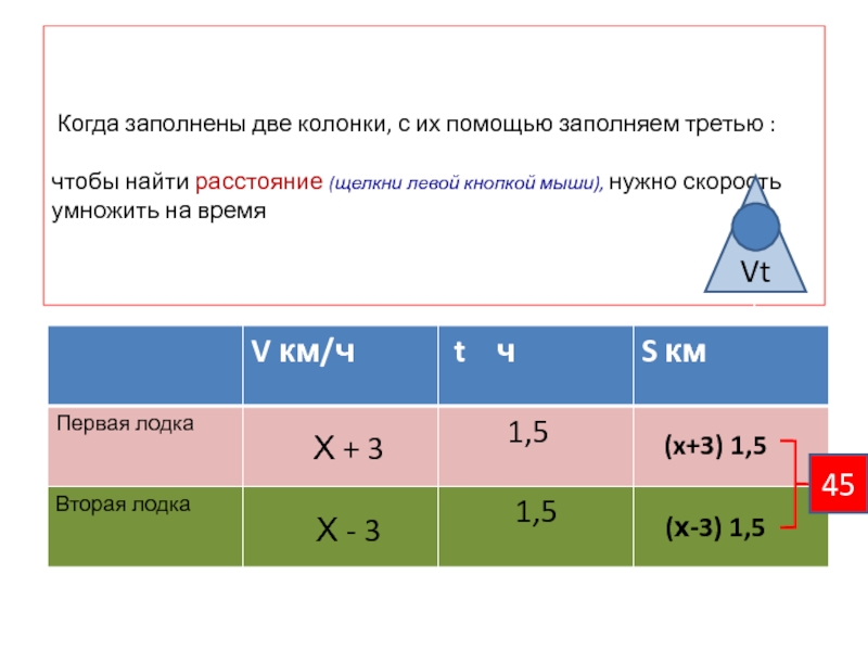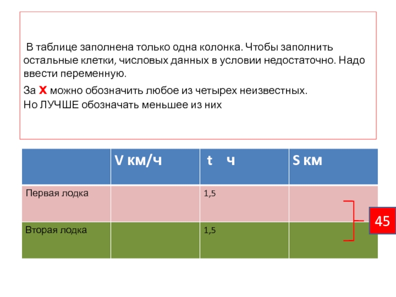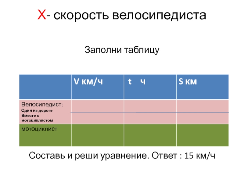 2. Определяемся с х, записываем (выражаем) через х все неизвестные данные . Особое внимание – величинам, входящим в формулу-ключ : время, скорость, путь