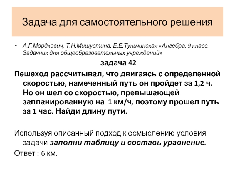 Решаем уравнение. Проверяем, соответствует ли полученный ответ смыслу задачи (например, не получилось ли у нас отрицательное расстояние или скорость)