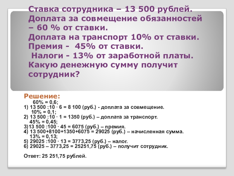 6) 29025 – 3773,25 = 25251,75 (руб.) – получит сотрудник.