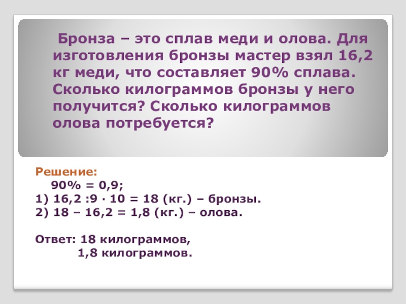 1) 16,2 :9 ∙ 10 = 18 (кг.) – бронзы.