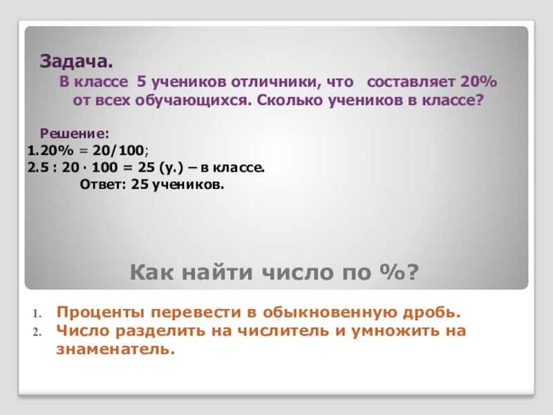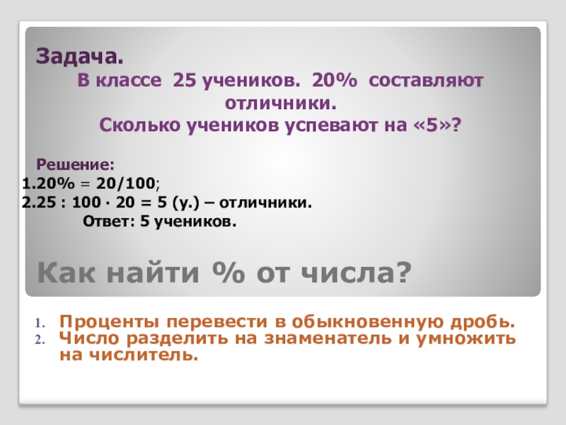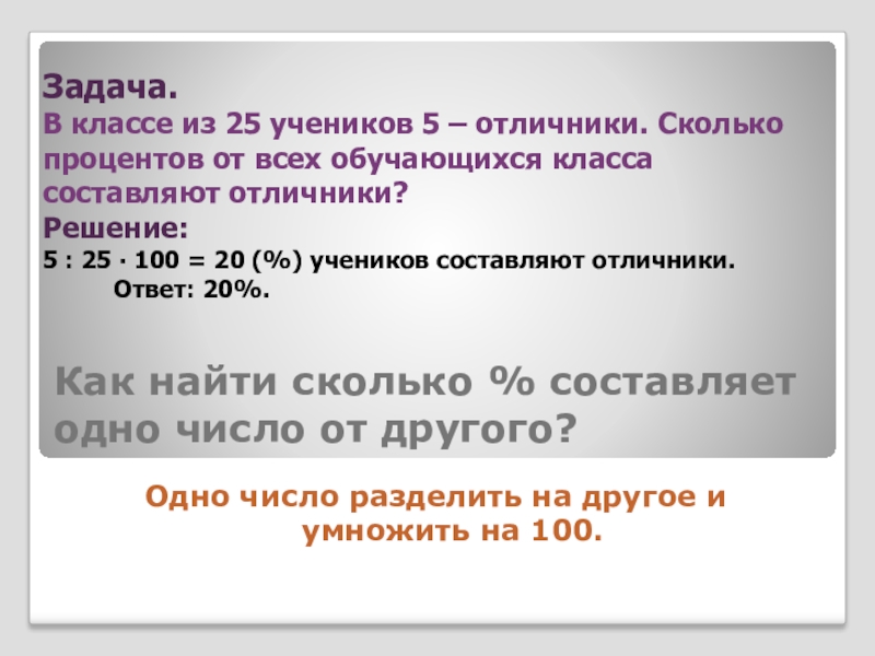 В классе из 25 учеников 5 – отличники. Сколько процентов от всех обучающихся класса составляют отличники?