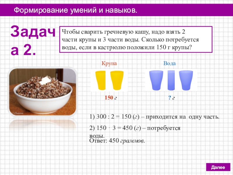 2) 150 ⋅ 3 = 450 (г) – потребуется воды.