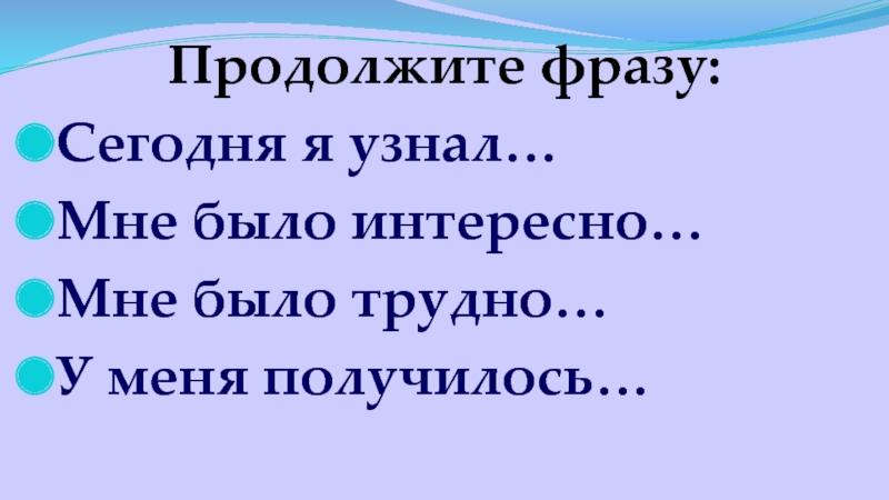 Продолжите фразу:Сегодня я узнал…Мне было интересно…Мне было трудно…У меня получилось…