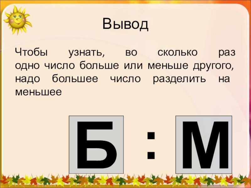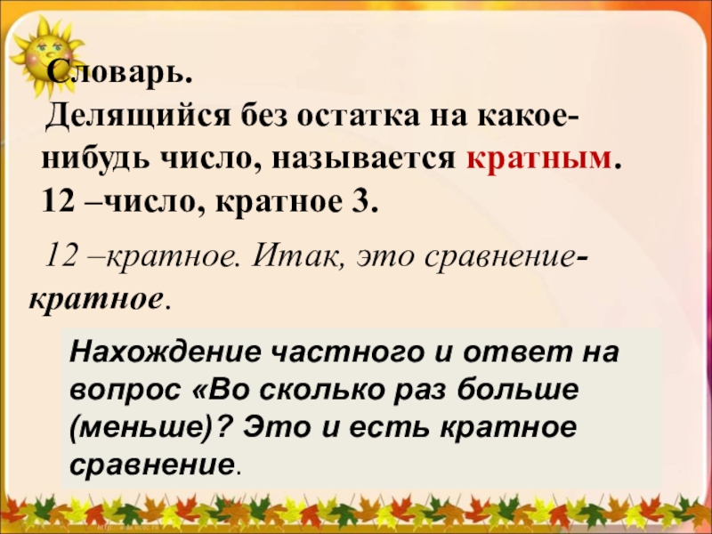 Нахождение частного и ответ на вопрос «Во сколько раз больше (меньше)? Это и есть кратное сравнение.