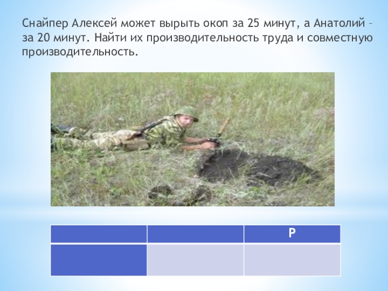 Слайд 7Снайпер Алексей может вырыть окоп за 25 минут, а Анатолий –