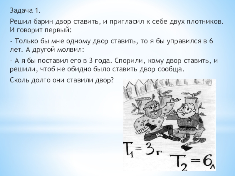 Задача 1. Решил барин двор ставить, и пригласил к себе двух плотников. И говорит первый:- Только бы