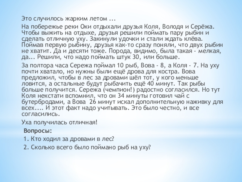 Коля, Володя и Серёжа. Чтобы выжить на отдыхе, друзья решили поймать пару рыбин и сделать отличную уху. Закинули удочки и стали ждать клёва. Поймав первую рыбину, друзья как-то сразу поняли, что двух рыбин не хватит. Да и десяти тоже. Порода, видимо, была такая - мелкая, да... Решили, что надо поймать штук 30, или больше.