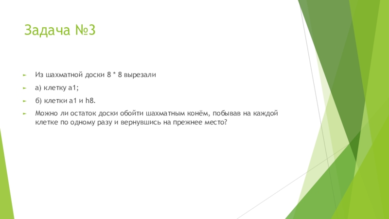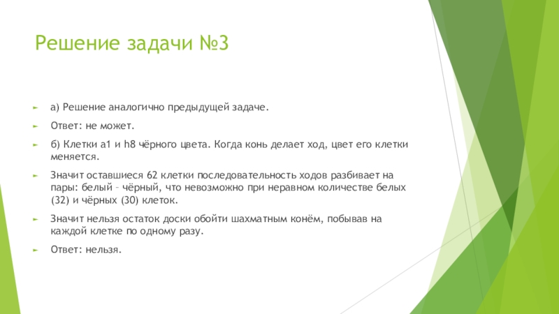 Решение задачи №3а) Решение аналогично предыдущей задаче. Ответ: не может.б) Клетки а1 и h8 чёрного цвета. Когда
