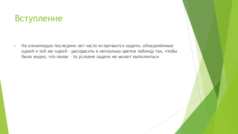ВступлениеНа олимпиадах последних лет часто встречаются задачи, объединённые одной и той же идеей – раскрасить в несколько цветов таблицу так, чтобы было видно, что какое – то условие задачи не может выполняться