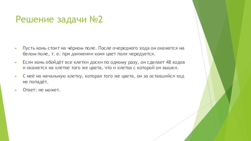 Решение задачи №2Пусть конь стоит на чёрном поле. После очередного хода он окажется на белом поле, т.