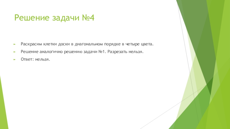 Решение задачи №4Раскрасим клетки доски в диагональном порядке в четыре цвета.Решение аналогично решению задачи №1. Разрезать нельзя.Ответ: