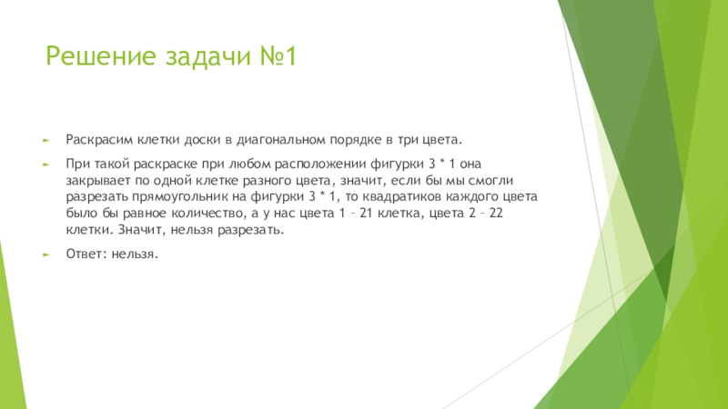 Решение задачи №1Раскрасим клетки доски в диагональном порядке в три цвета.При такой раскраске при любом расположении фигурки