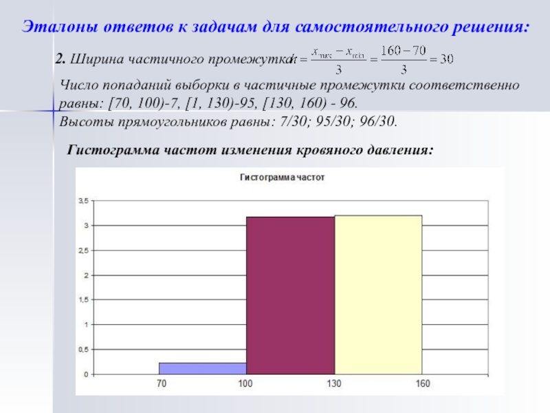 Число попаданий выборки в частичные промежутки соответственно равны: [70, 100)-7, [1, 130)-95, [130, 160) - 96.