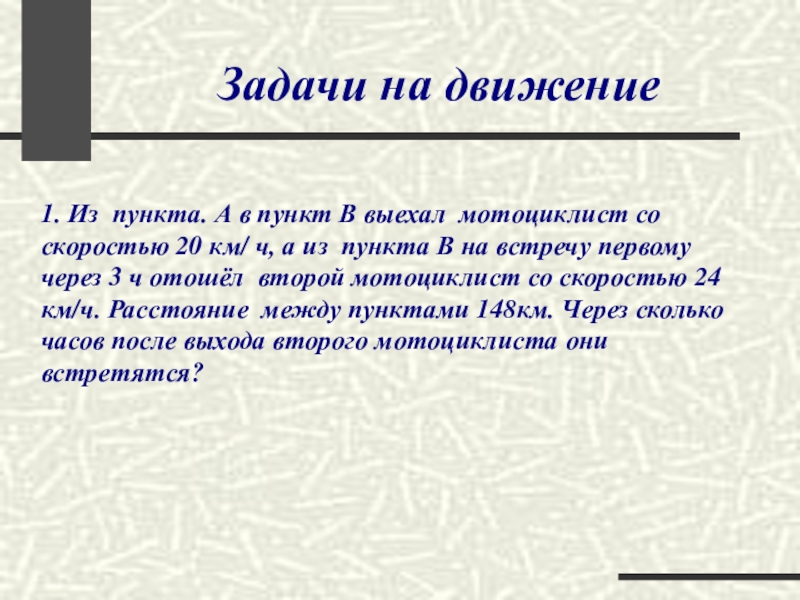 Задачи на движение 1. Из пункта. А в пункт В выехал мотоциклист со скоростью 20 км/ ч, а из пункта В на встречу первому через 3 ч отошёл второй мотоциклист со скоростью 24 км/ч. Расстояние