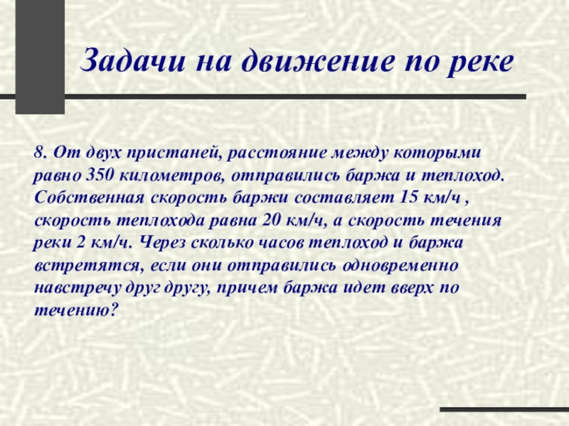 Задачи на движение по реке 8. От двух пристаней, расстояние между которыми равно 350 километров, отправились