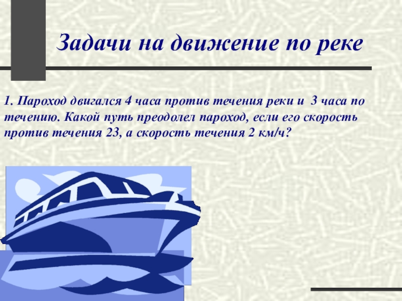 Задачи на движение по реке 1. Пароход двигался 4 часа против течения реки и 3 часа