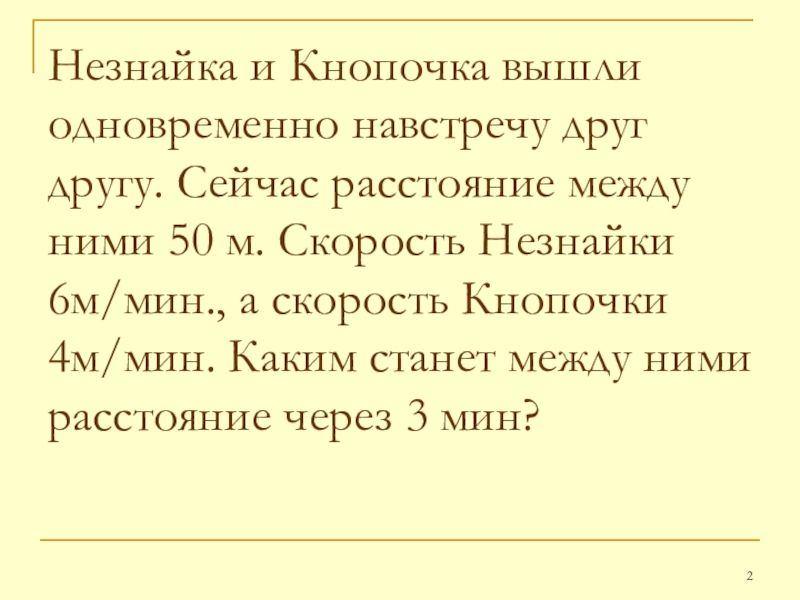 Слайд 2Незнайка и Кнопочка вышли одновременно навстречу друг другу. Сейчас расстояние между