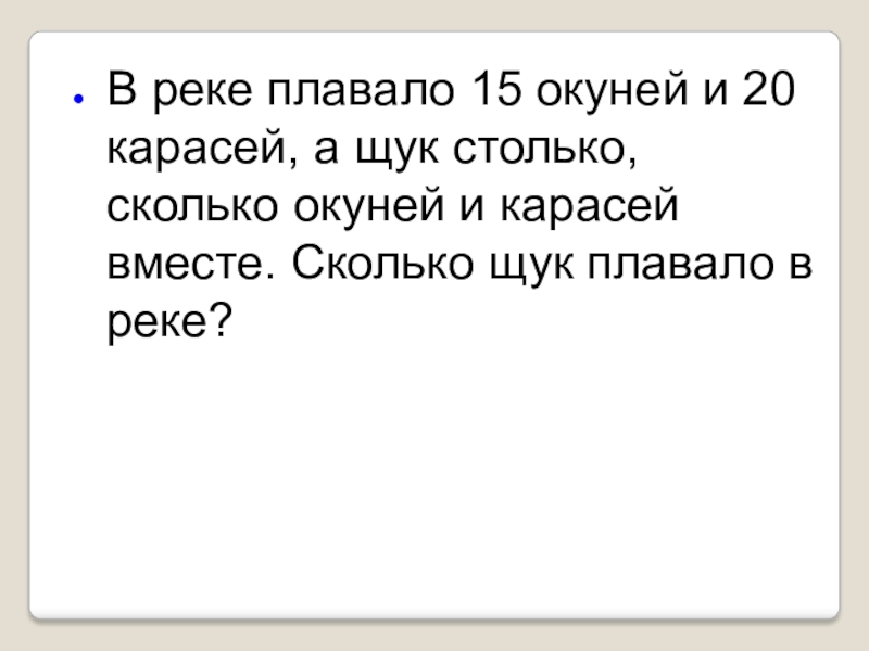 Слайд 2В реке плавало 15 окуней и 20 карасей, а щук столько,