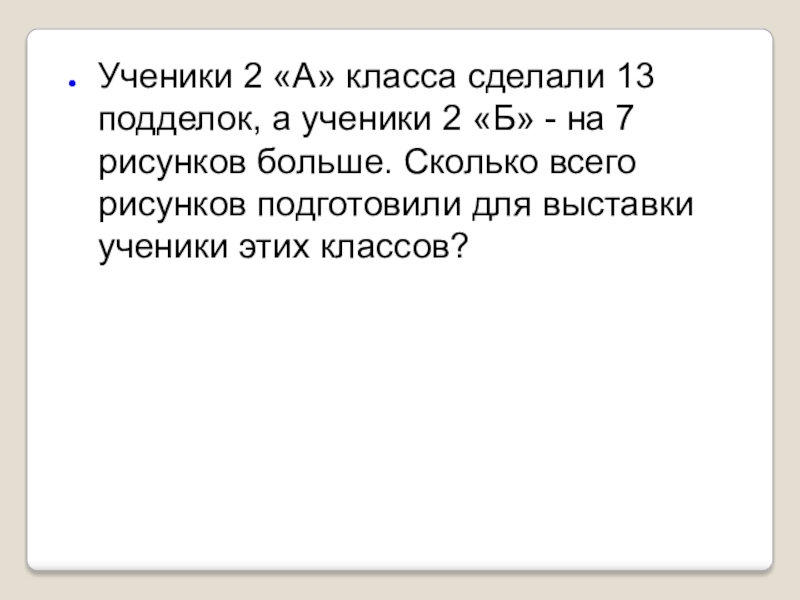 Ученики 2 «А» класса сделали 13 подделок, а ученики 2 «Б» - на 7 рисунков больше. Сколько