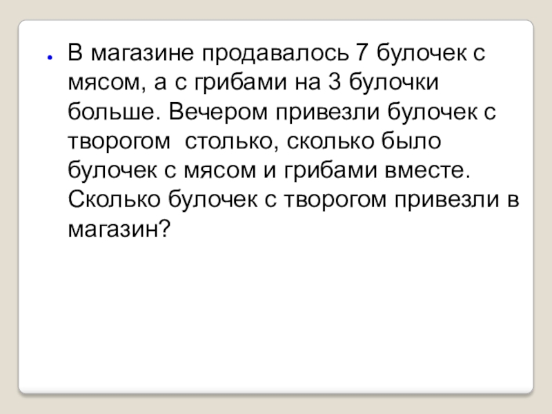 В магазине продавалось 7 булочек с мясом, а с грибами на 3 булочки больше. Вечером привезли булочек