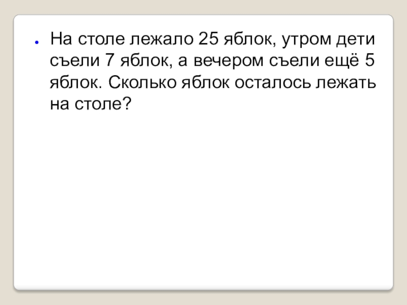Слайд 3На столе лежало 25 яблок, утром дети съели 7 яблок, а