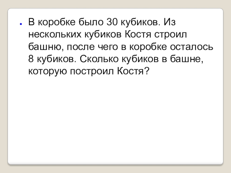 Слайд 8В коробке было 30 кубиков. Из нескольких кубиков Костя строил башню,