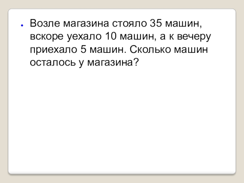 Слайд 4Возле магазина стояло 35 машин, вскоре уехало 10 машин, а к