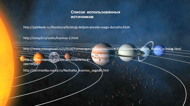 Список использованных источников .http://ppt4web.ru/literatura/ltolstojj-detjam-pravda-vsego-dorozhe.htmlhttp://smayli.ru/smile/kosmos-2.htmlhttp://www.nivasposad.ru/school/homepages/belousova/2014-2015/konkurs/maltsev_roman_o/index.htmlhttp://www.vpered-shagaya.pro/планеты-в-сентябре/http://zanimatika.narod.ru/Nachalka_kosmos_zagadki.htm