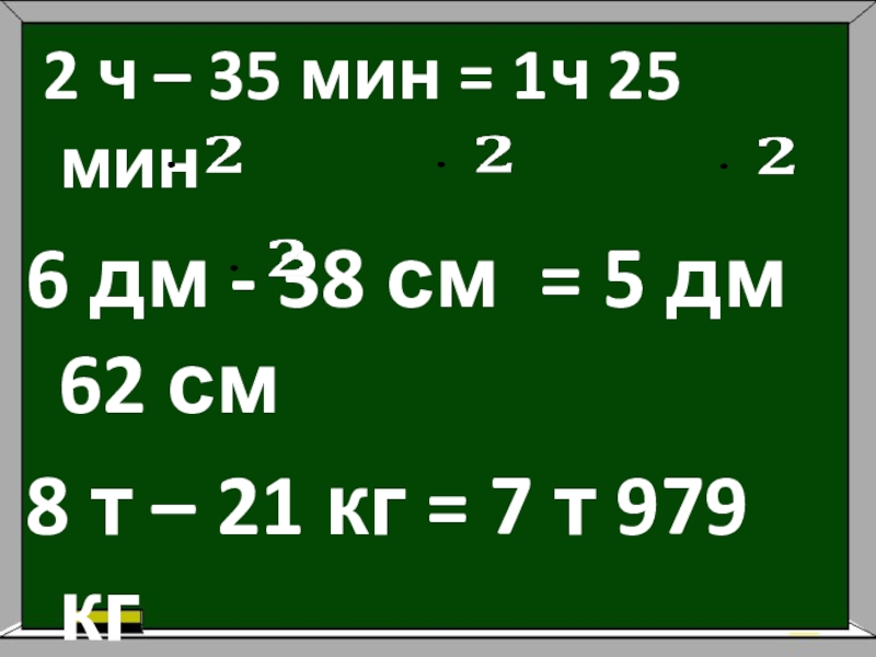 2 ч – 35 мин = 1ч 25 мин 6 дм - 38 см = 5