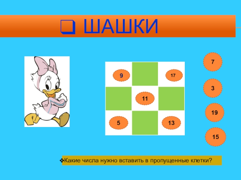 шашки91711513731915Какие числа нужно вставить в пропущенные клетки?
