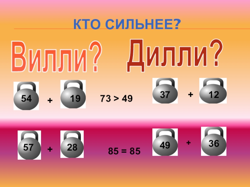 КТО СИЛЬНЕЕ?Вилли?Дилли?5419572837124936++++73 > 4985 = 85