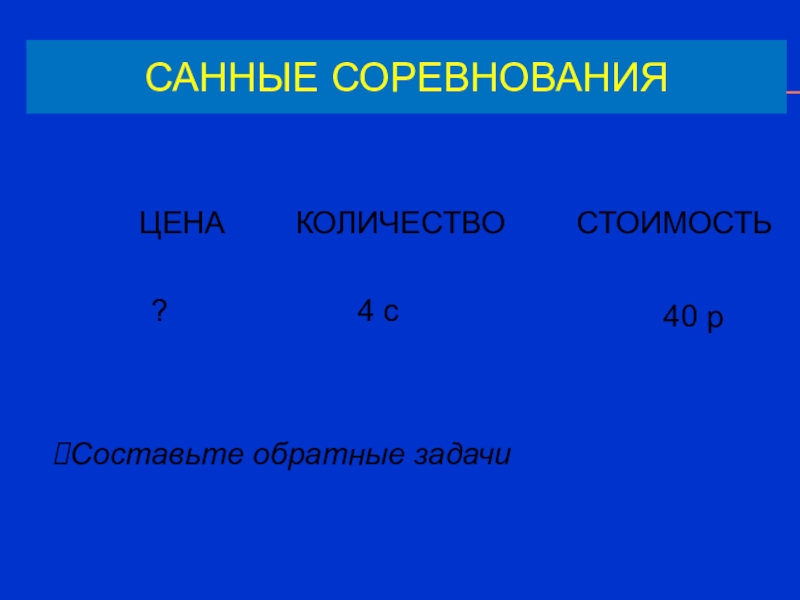 Санные соревнованияЦЕНАКОЛИЧЕСТВОСТОИМОСТЬ?4 с40 рСоставьте обратные задачи