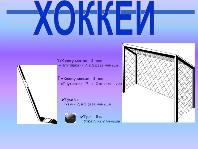 ХОККЕЙ«Хвастунишка» – 4 гола«Плутишка» - ?, в 2 раза меньше	«Хвастунишки» – 4 гола«Плутишки» - ?, на 2