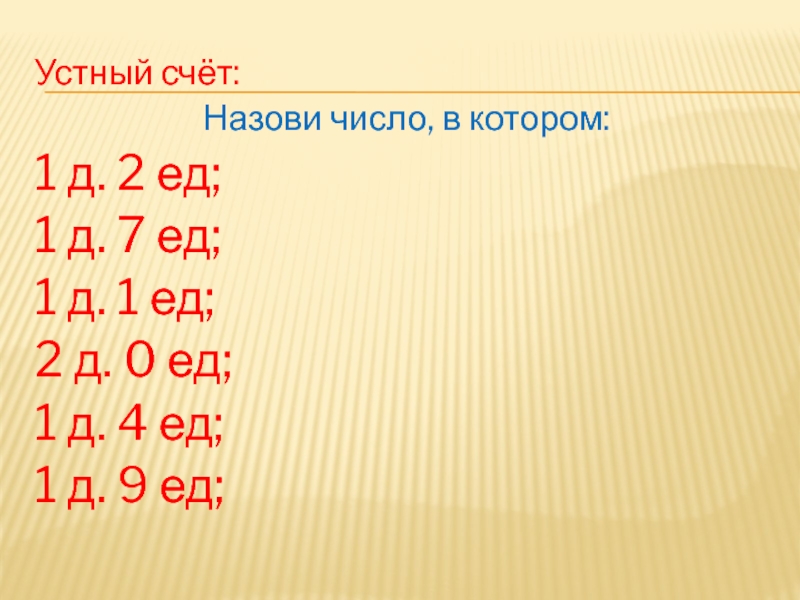 Устный счёт:Назови число, в котором:1 д. 2 ед; 1 д. 7 ед;1 д. 1 ед;2 д. 0