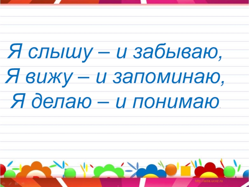 Я слышу – и забываю,Я вижу – и запоминаю,Я делаю – и понимаю.