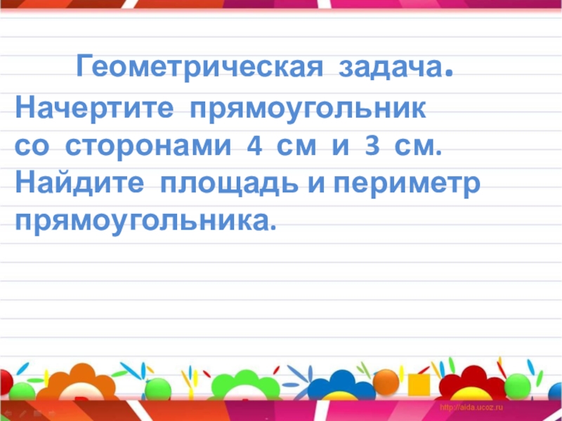 Геометрическая задача.Начертите прямоугольник  со сторонами 4 см и 3 см. Найдите площадь и периметрпрямоугольника.