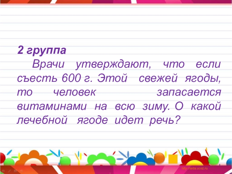 2 группа  Врачи утверждают, что если съесть 600 г. Этой  свежей ягоды, то человек