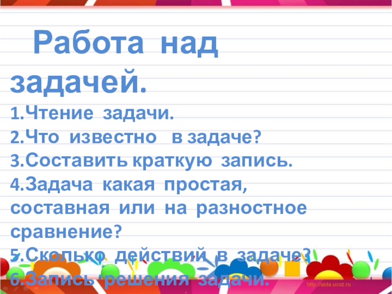 Работа над задачей.1.Чтение задачи.2.Что известно  в задаче?3.Составить краткую запись.4.Задача какая простая, составная или на