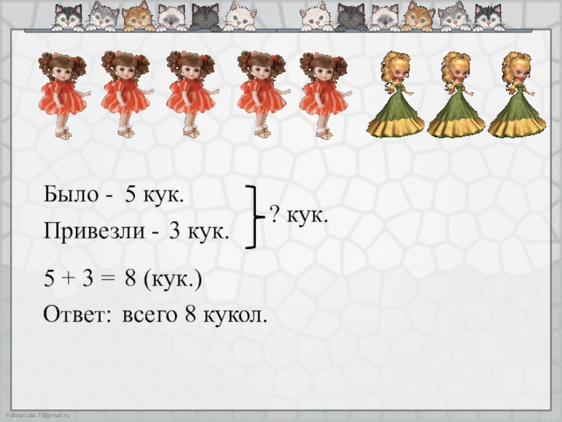 Было -5 кук.Привезли -3 кук.? кук.5 + 3 =8(кук.)Ответ:всего 8 кукол.