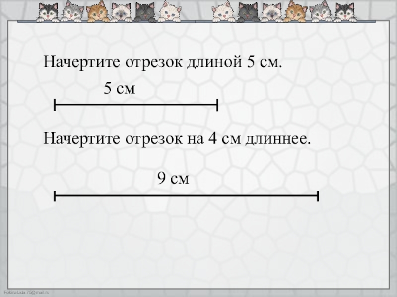 Начертите отрезок длиной 5 см.5 смНачертите отрезок на 4 см длиннее.9 см