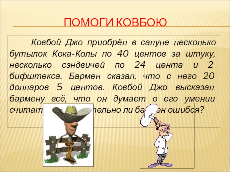 Кока-Колы по 40 центов за штуку, несколько сэндвичей по 24 цента и 2 бифштекса. Бармен сказал, что с него 20 долларов 5 центов. Ковбой Джо высказал бармену всё, что он думает о его умении считать. Действительно ли бармен ошибся?