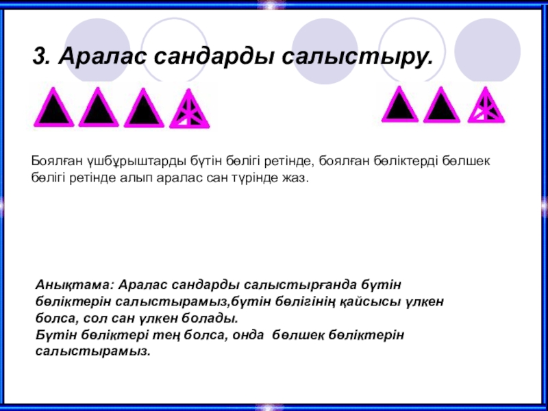 Анықтама: Аралас сандарды салыстырғанда бүтін бөліктерін салыстырамыз,бүтін бөлігінің қайсысы үлкен болса, сол сан үлкен болады.